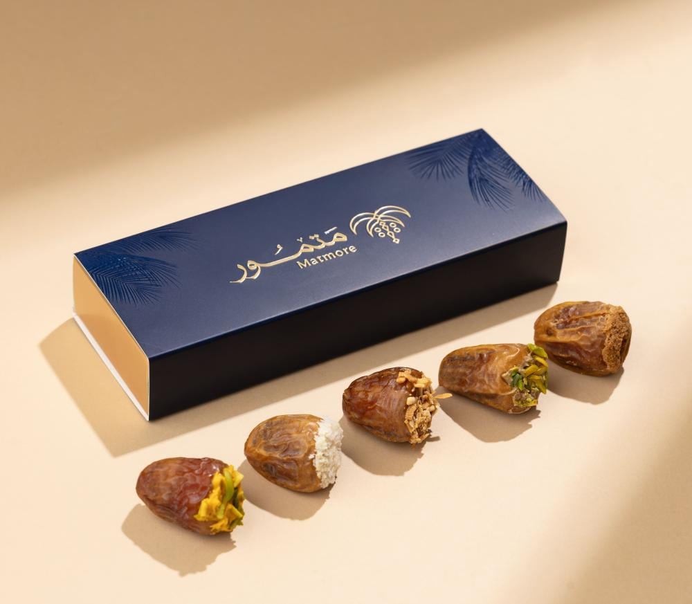 • يحتوي على خمس قطع تمر، كل قطعة بحشوة مختلفة.